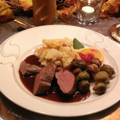 *Rosa gebratene Fasanenbrust mit Champagner-Spitzkohl an Hagebutten-Kirschsoße auf Bandnudeln